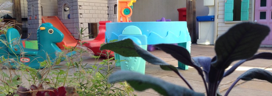 The garden includes a table for outdoor drawing and quiet activities, sand and water trays for sensory play, Wendy house and role play kitchen, a flower bed for growing and planting, see-saws, children’s sized camping equipment, bucket stilts, paper and pencils, chalks and much more!